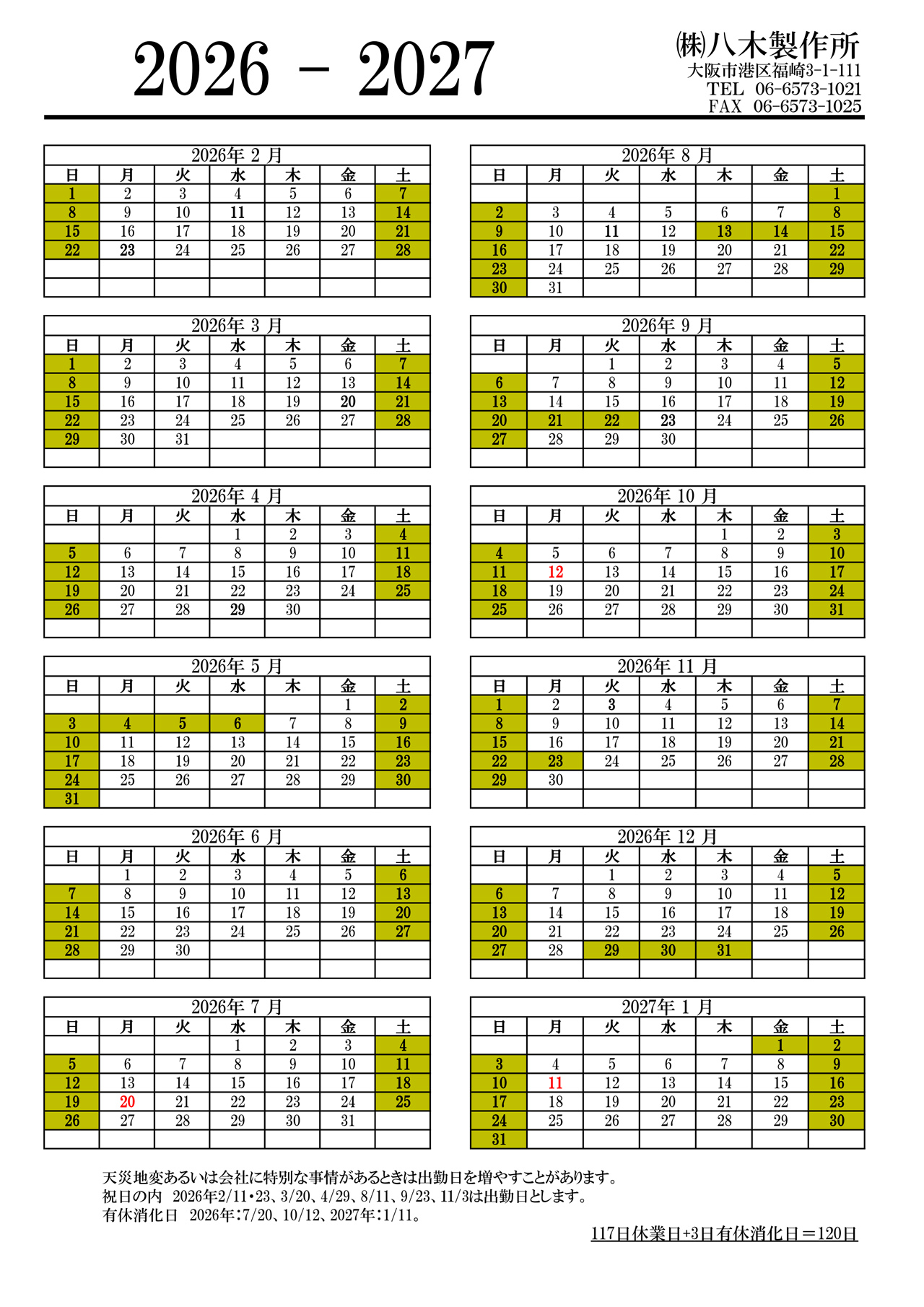 当社の2026年営業日カレンダーを公開しています。